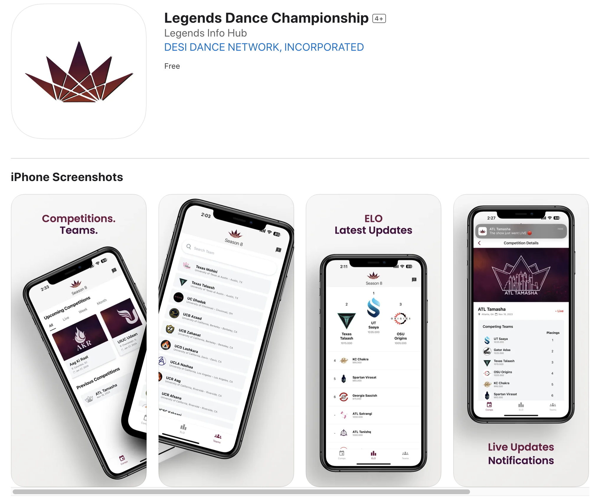 I built the Legends app, the central hub for all information for the Desi Dance Network (DDN) fusion circuit. It features real-time show updates, an ELO simulator, and more. Over 4000+ downloads. Find it here