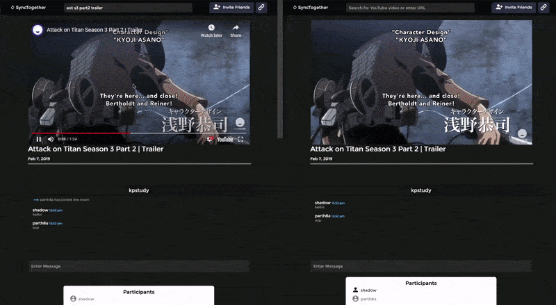 Watch YouTube videos synced in real-time, together with your friends. Create your own personal room and invite your friends for a YouTube watch party 🎉 Try it out here https://github.com/kaustubnvd/SyncTogether